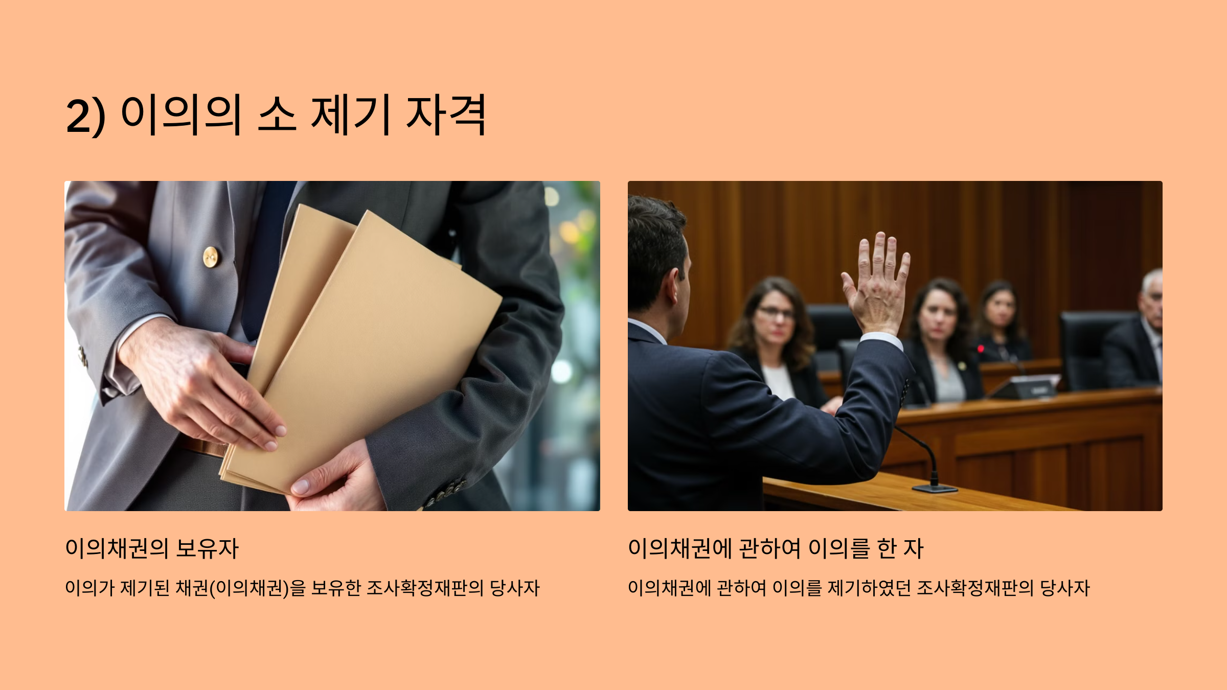 조사확정재판에 대하여 이의의 소를 제기할 수 있는 자는 '이의가 제기된 채권(이의채권)의 보유자' 또는 '이의채권에 관하여 이의를 제기하였던 자'로서 '조사확정재판의 당사자'이었던 자에 한한다.