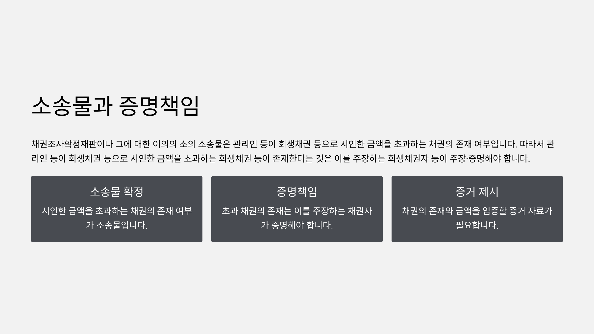 채권조사확정재판이나 그에 대한 이의의 소의 소송물은 관리인 등이 회생채권 등으로 시인한 금액을 초과하는 채권의 존재 여부이다. 따라서 관리인 등이 회생채권 등으로 시인한 금액을 초과하는 회생채권 등이 존재한다는 것은 이를 주장하는 회생채권자 등이 주장·증명해야 한다.